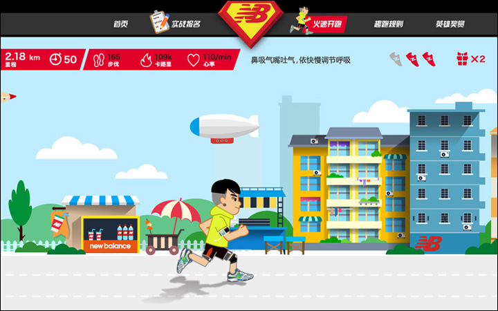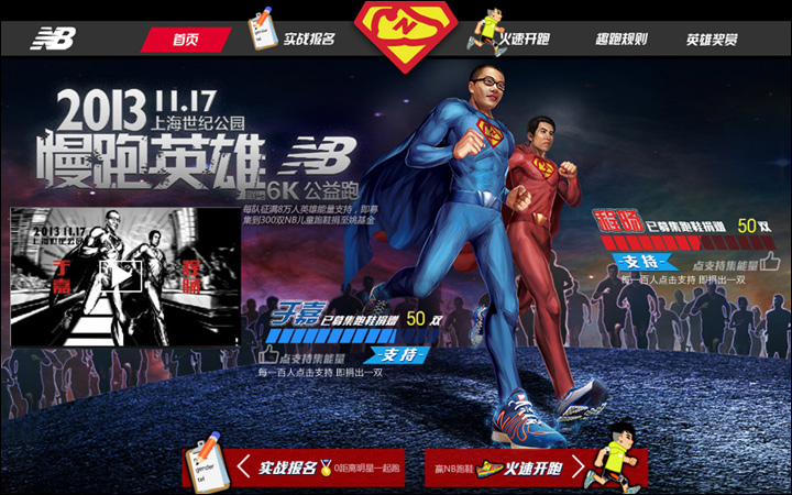 作為其互動(dòng)營(yíng)銷(xiāo)代理商的Leadinfo(立特整合營(yíng)銷(xiāo)傳播機構)便以英雄扮演的趣味方式為New Balance創(chuàng )意了一款在線(xiàn)趣跑游戲http://newbalance.renren.com,用戶(hù)只需用人人網(wǎng)賬號登錄,即可選擇卡通角色邊跑邊體驗身為英雄的快感。