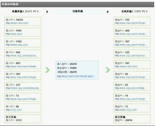訪(fǎng)客經(jīng)常在網(wǎng)站中的各個(gè)頁(yè)面之間跳轉,訪(fǎng)問(wèn)的路徑不勝枚舉,但可以通過(guò)觀(guān)察焦點(diǎn)頁(yè)面及其上下游頁(yè)面,掌握訪(fǎng)客的來(lái)路和去向,發(fā)現較普遍的訪(fǎng)客訪(fǎng)問(wèn)習慣。頁(yè)面訪(fǎng)問(wèn)軌跡即用來(lái)完成該功能,用戶(hù)可自由指定觀(guān)察焦點(diǎn)頁(yè)面,系統會(huì )列出該頁(yè)面的前十位來(lái)路頁(yè)面和去向頁(yè)面。對觀(guān)察焦點(diǎn)頁(yè)面而言,其自身的導入、導出PV的多少能夠反映出該頁(yè)面在網(wǎng)站的權重地位,而通過(guò)觀(guān)察來(lái)源和去向頁(yè)面又能最大限度的了解到訪(fǎng)客的行為習慣及興趣點(diǎn)。