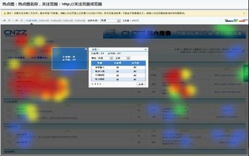CNZZ統計工具在設計及研發(fā)上更加注重用戶(hù)體驗與實(shí)用性,用戶(hù)只需將關(guān)注的受訪(fǎng)頁(yè)面鏈接添加到“熱點(diǎn)圖”功能中,并保證該頁(yè)面已成功放置CNZZ“站長(cháng)統計”代碼,第二天即可查看“熱點(diǎn)圖”相關(guān)數據情況。在申請開(kāi)通“熱點(diǎn)圖”功能后,用戶(hù)可同時(shí)關(guān)注十個(gè)熱點(diǎn)頁(yè)面。打開(kāi)某一頁(yè)面熱點(diǎn)圖,興趣點(diǎn)展現一目了然,圖中紅色區域表示點(diǎn)擊熱度最高,橙色、黃色、綠色次之,而藍色區域則表示點(diǎn)擊熱度最低。